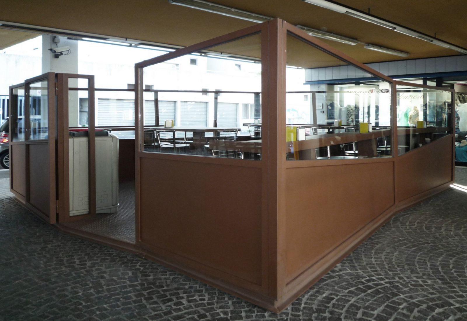 Il progetto riprende le geometrie del locale per segnare un’isola. In pianta le linee si piegano per marcare i percorsi e creare un invito in corrispondenza dell’entrata, giustapposta a quella del locale. Negli alzati correnti e montanti si inclinano per definire campi pieni nella parte bassa e trasparenti nella parte alta.