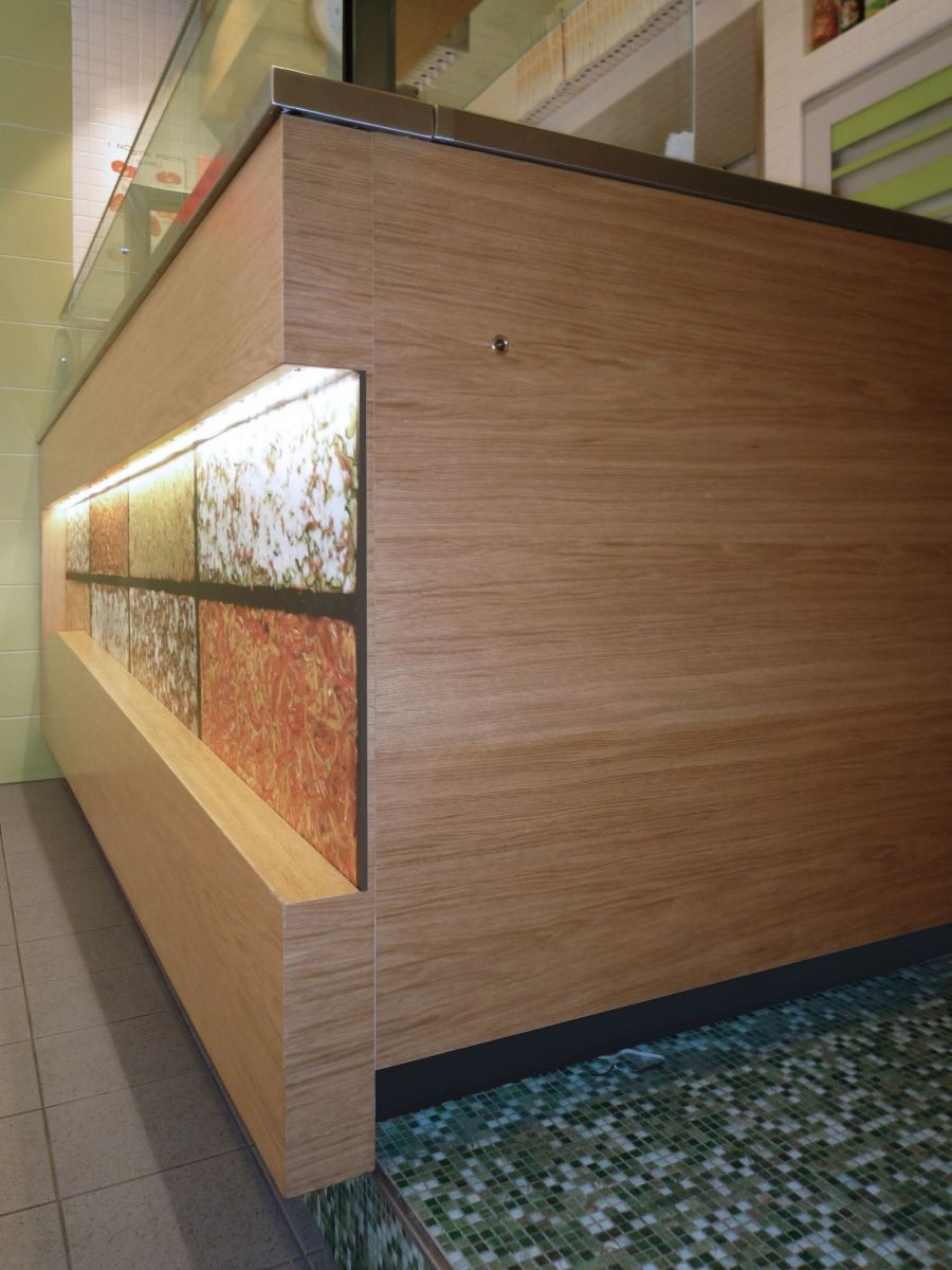 Per non rinunciare all’immagine si è scelto un rivestimento in legno, un vestito di rovere naturale solamente lucidato che, corredato a un progetto grafico, ha reso il banco vendita un oggetto di arredo.