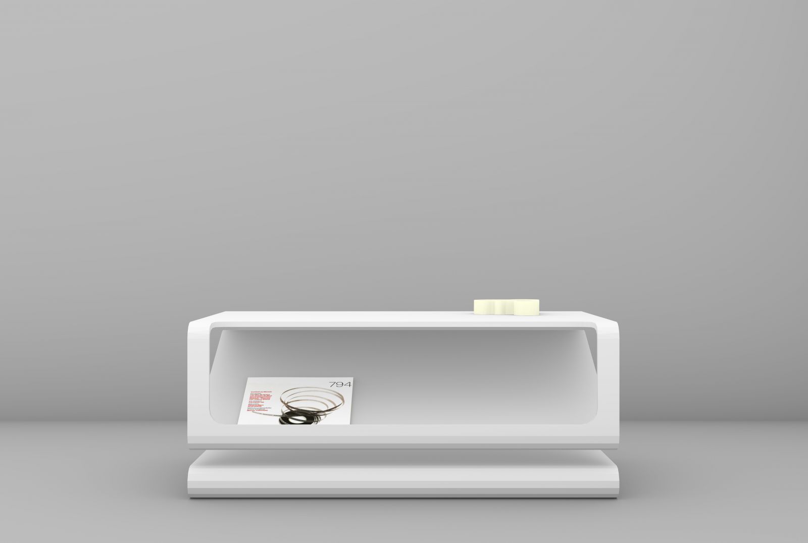 Il materiale ha permesso di pensare un oggetto caratterizzato da diverse pieghe e forature, grazie alla sua resistenza e omogeneità nello spessore. La prima superficie orizzontale costituisce il piano del tavolino, la seconda inclinata permette di riporre le riviste o il libro di lettura, la terza nuovamente orizzontale consente di poggiare piccoli oggetti da avere sempre a portata di mano e con un ultima piega il tavolino si distacca dal pavimento.